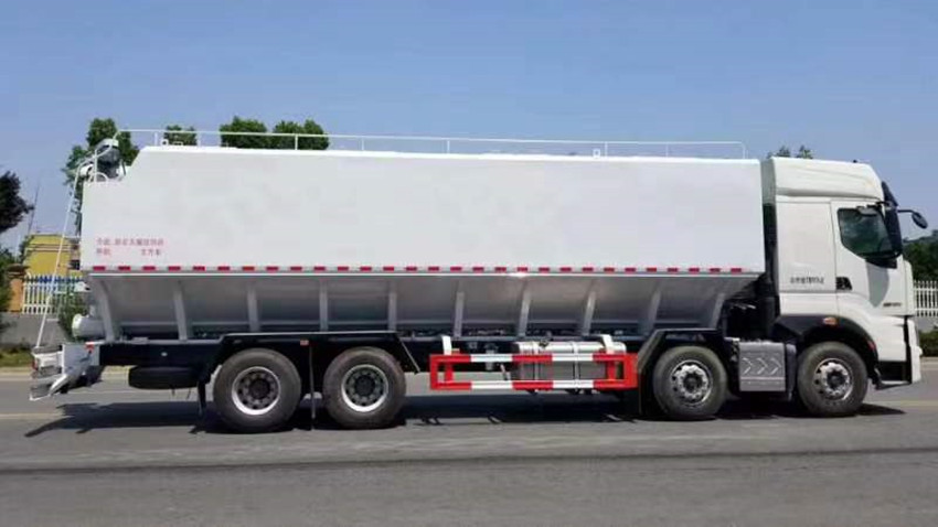 散裝飼料運(yùn)輸車,散裝飼料車的飼料罐架設(shè)在卡車的底盤上,罐頂開有進(jìn)料口.頂部的一根螺旋輸送卸料管(俗稱卸料絞龍)則可自由回轉(zhuǎn)和抬升,抬升的仰角可達(dá)60度。運(yùn)輸時(shí),頂部的螺旋管平臥在罐頂;卸料時(shí)則抬起,使管端的出料口與畜禽飼養(yǎng)場貯料罐頂部的進(jìn)料門相接,駕駛室內(nèi)裝有操縱裝置(操縱裝置也可裝置在罐體尾部),卸料時(shí)通過車底的動(dòng)力輸出軸和減速器來驅(qū)動(dòng)螺旋,以完成卸料。