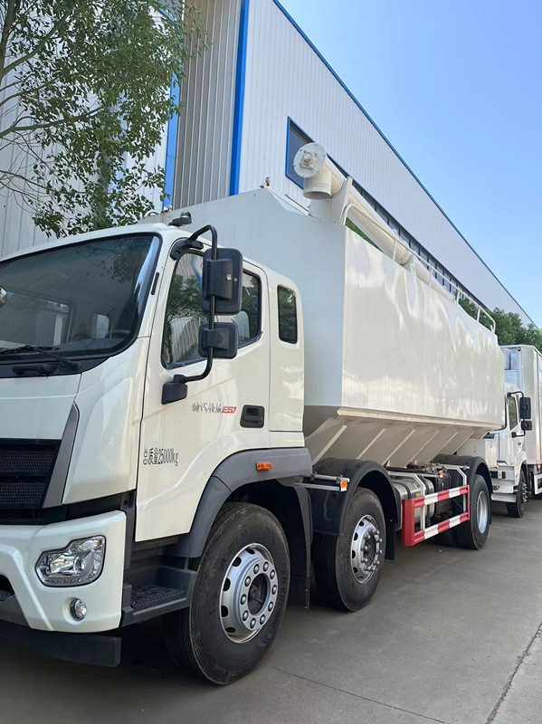 散裝飼料運(yùn)輸車(chē),散裝飼料車(chē)的飼料罐架設(shè)在卡車(chē)的底盤(pán)上,罐頂開(kāi)有進(jìn)料口.頂部的一根螺旋輸送卸料管(俗稱卸料絞龍)則可自由回轉(zhuǎn)和抬升,抬升的仰角可達(dá)60度。運(yùn)輸時(shí),頂部的螺旋管平臥在罐頂;卸料時(shí)則抬起,使管端的出料口與畜禽飼養(yǎng)場(chǎng)貯料罐頂部的進(jìn)料門(mén)相接,駕駛室內(nèi)裝有操縱裝置(操縱裝置也可裝置在罐體尾部),卸料時(shí)通過(guò)車(chē)底的動(dòng)力輸出軸和減速器來(lái)驅(qū)動(dòng)螺旋,以完成卸料。