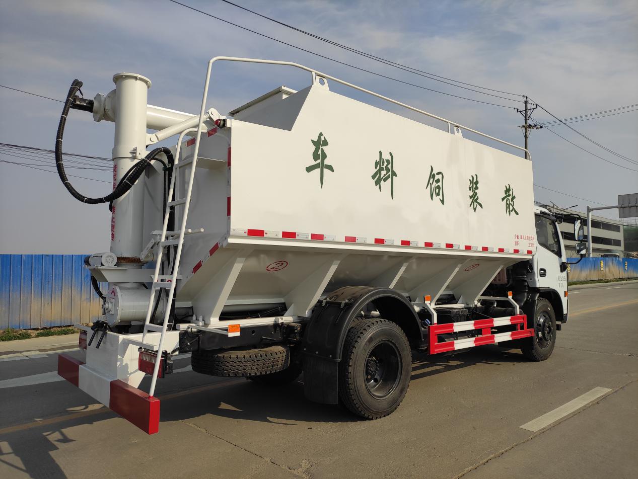 散裝飼料運輸車,散裝飼料車的飼料罐架設在卡車的底盤上,罐頂開有進料口.頂部的一根螺旋輸送卸料管(俗稱卸料絞龍)則可自由回轉和抬升,抬升的仰角可達60度。運輸時,頂部的螺旋管平臥在罐頂;卸料時則抬起,使管端的出料口與畜禽飼養(yǎng)場貯料罐頂部的進料門相接,駕駛室內裝有操縱裝置(操縱裝置也可裝置在罐體尾部),卸料時通過車底的動力輸出軸和減速器來驅動螺旋,以完成卸料。